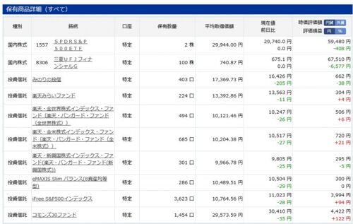こんにちわ ただいまのこところ こんな感じです。 投資信託(金額/NISA・つみたてNISA預り) 保有口数 取得単価 基準価額 評価損益 三菱UFJ国際-eMAXIS Slim 先進国株式インデックス 5,831 10,976 11,188 123 楽天-楽天・全米株式インデック…